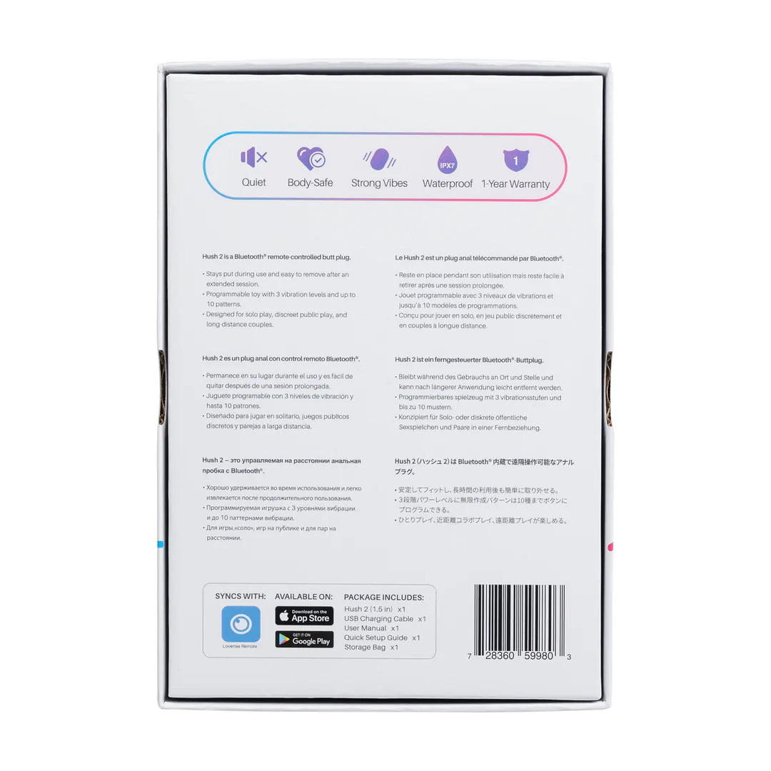El Hush 2 de 1.5 pulgadas ofrece una experiencia mejorada para los usuarios que buscan una estimulación anal potente. El diseño suave y aerodinámico, sin el patrón en espiral anterior, garantiza la máxima comodidad. Su carga magnética hace que la recarga sea rápida y sencilla, mientras que la base acampanada asegura un ajuste firme, permitiendo un juego prolongado y sin preocupaciones. El Hush 2 ofrece vibraciones profundas y retumbantes, perfectas para los usuarios que buscan sensaciones intensas. Al ser un dispositivo completamente impermeable, puede usarse en diversos entornos húmedos, como duchas o bañeras. Usando la aplicación Lovense Remote, los usuarios pueden ajustar los patrones de vibración, sincronizarlos con sonidos o controlar el dispositivo de forma remota desde cualquier lugar. El Hush 2 es una excelente opción para quienes buscan placer discreto y manos libres.